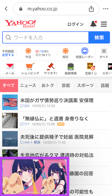 上スクショはピクチャーインピクチャーを利用してYahooを見ながら動画再生しています。バックグランド再生では画面をオフにしても音楽を聴き続けられるメリットがあります。
